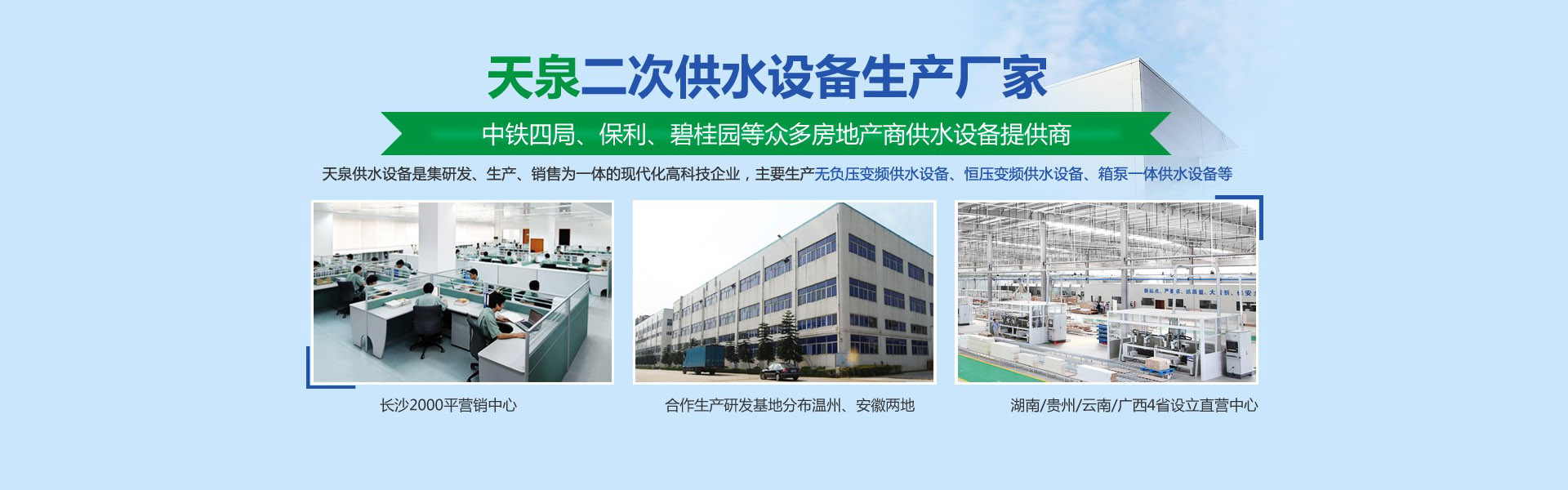 長(zhǎng)沙天泉供水設(shè)備有限公司位于長(zhǎng)沙雨花經(jīng)濟(jì)開發(fā)區(qū)。公司是集研發(fā)、生產(chǎn)、銷售為一體的現(xiàn)代化科技型企業(yè)公司生產(chǎn)銷售的產(chǎn)品有無負(fù)壓變頻供水設(shè)備、自來水加壓泵站、變頻調(diào)速恒壓供水設(shè)備、智慧標(biāo)準(zhǔn)泵房、智慧水務(wù)、一體化預(yù)制泵站、循環(huán)水系統(tǒng)工程等二十幾大類別。